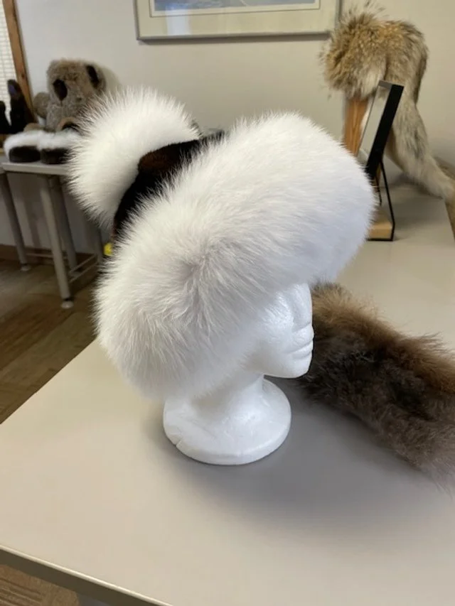 TOPPER HAT is a beanie style hat with a fur band of your choosing and a matching pom-pom on top with sheared beaver lining. This hat is Extremely popular. It is available in all in stock fur but it looks best with shorter fur for the main body of the hat, River Otter, Mink. Muskrat exc.